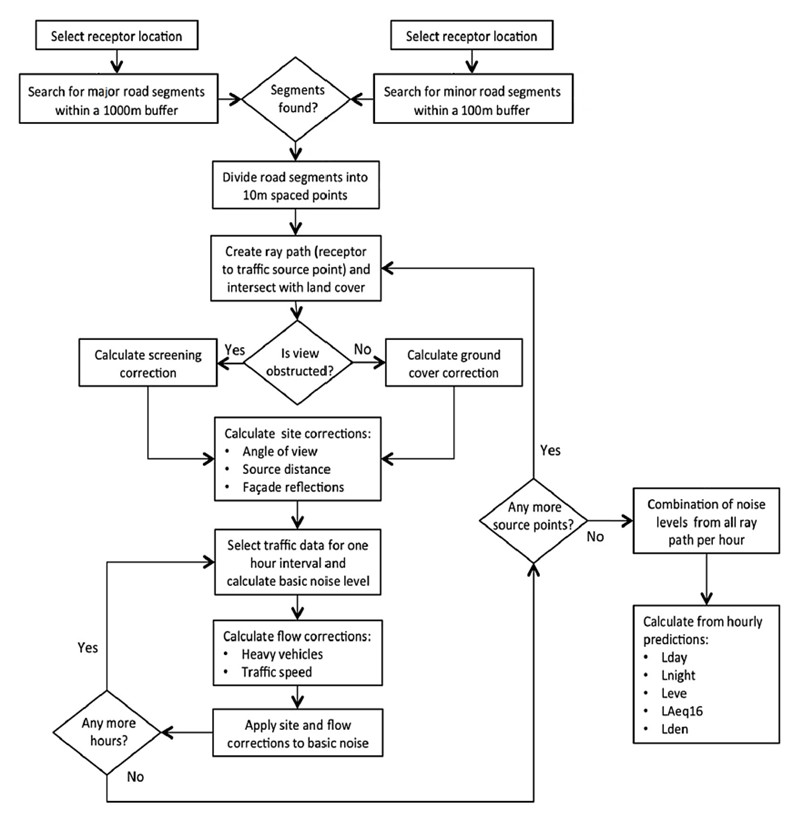 In brief, the coordinates of each receptor are assigned to the closest building. The building façade that is likely to experience the most noise levels is identified by considering the proximity and vehicle counts on nearby roads, and a receptor (point) is placed 1m away from the building. A GIS operation locates all major roads within a 1000m radius and all minor roads within a 100m radius of each receptor. These roads are then divided into a series of source points at 20m intervals along each road segment. Next, rays are projected from the receptor point to each source point as a direct path and the land cover types and buildings along this line are ascertained. For each ray path in turn, the noise level at each source point can be calculated using traffic flow data and the empirical relationships defined by CNOSSOS-EU. Following this, the receptor noise level is estimated according to the specific environments along the ray path and the CNOSSOS-EU sound propagation algorithms.