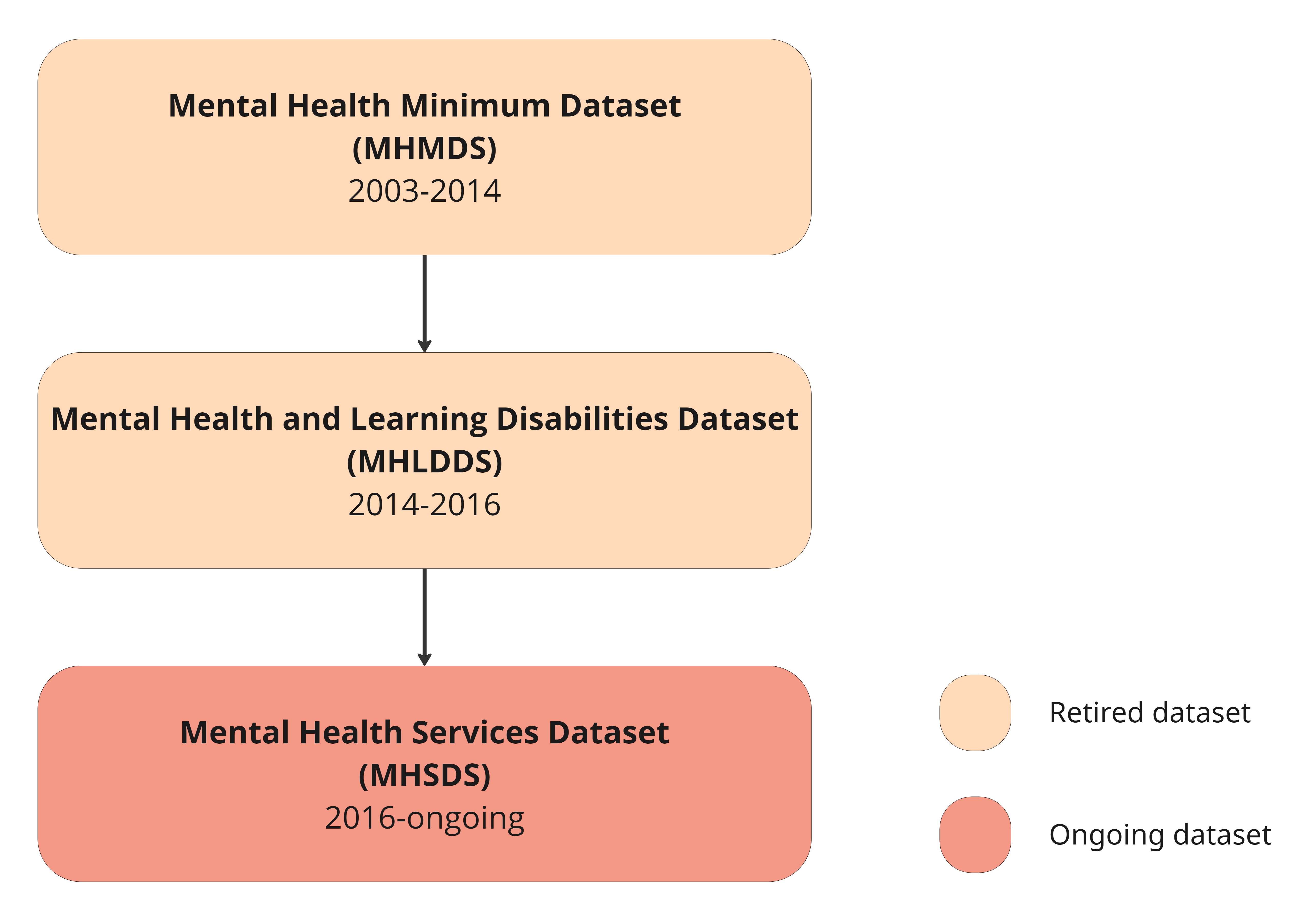 Data about mental health services was introduced in April 2000 to provide clinical information to align with the requirements of the National Service Framework for Mental Health. Published in 1999 by the Department of Health, this framework set a 10-year agenda for improving mental healthcare for working-age adults in England (for further information see Government policy and the National Service Framework for Mental Health: modelling and costing services in England). Over the years, the mental health dataset has evolved significantly as summarised in Figure 1. The first publication of the data was released in 2008, covering the period from 2003 to 2007, and was titled the Mental Health Minimum Dataset (MHMDS). MHMDS was replaced in 2014 by the Mental Health and Learning Disabilities Data Set (MHLDDS), which in turn was replaced in 2016 by the Mental Health Services Data Set (MHSDS).