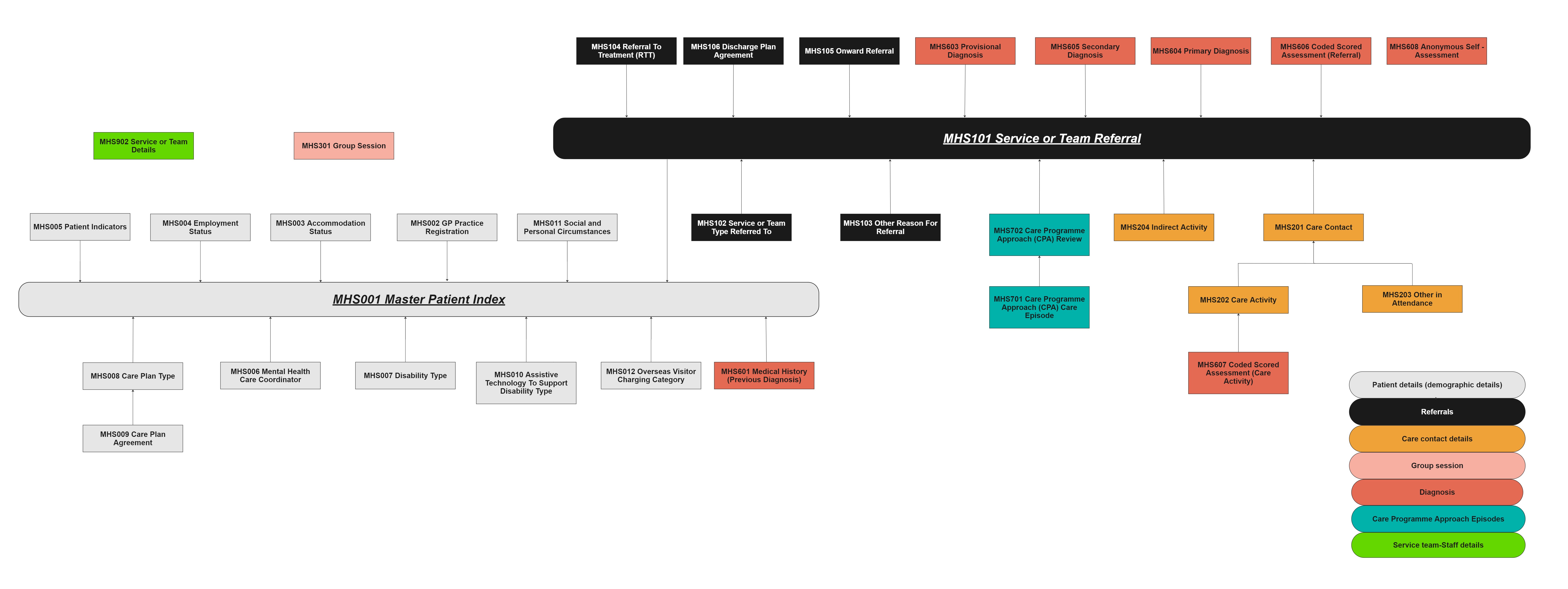 Linked to MHS001, Care Contact (MHS201), Diagnosis tables (MHS604–MHS605), Assessments (MHS606), and related referral tables. |